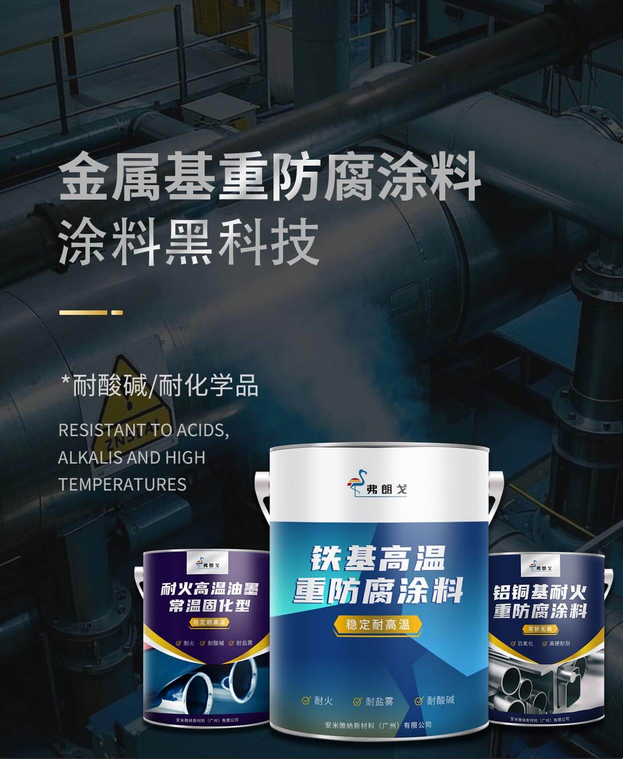 金属基高温重防腐涂料系列是安米微纳技术团队研发的高性能功能涂料,采用无机高温粘接剂为成膜物,加入功能粉体作为介质,通过分散工艺制成。