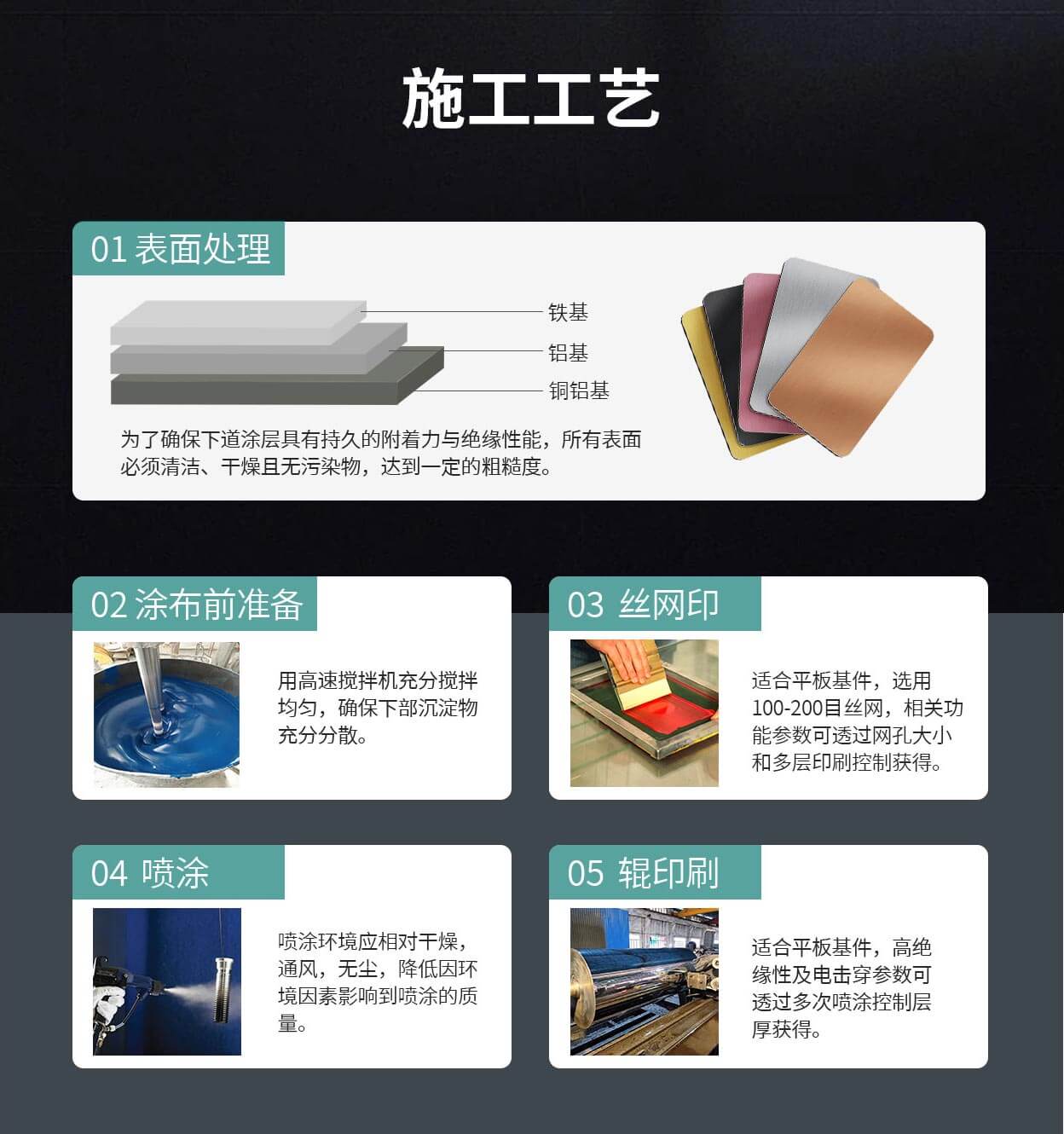 适用于喷涂、刷涂、辊涂、浸涂及丝网印刷等工艺,可在铁基金属表面形成耐高温、耐刮、耐酸碱、高硬度、高附着力及高耐候的功能涂层。