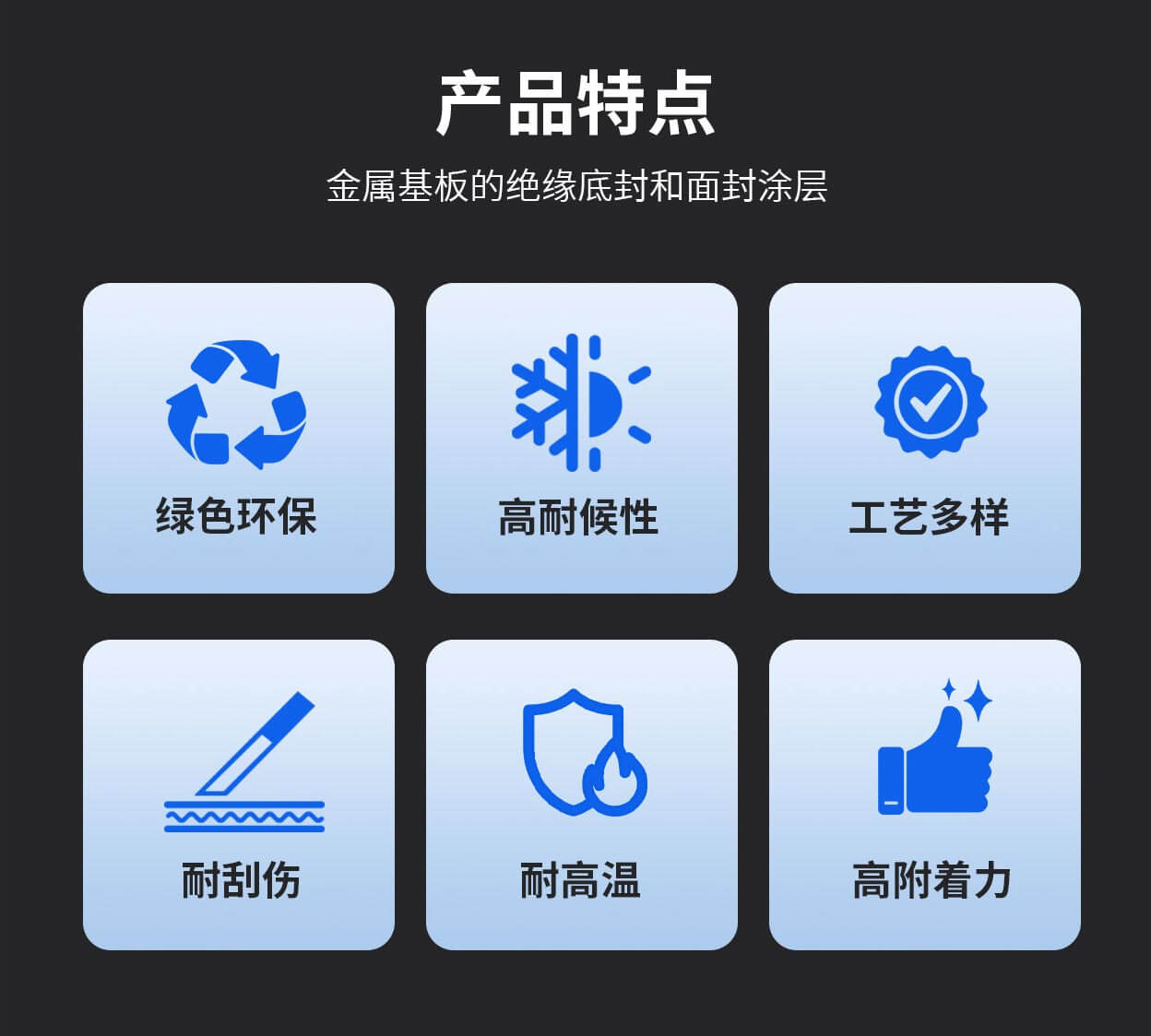 适用于喷涂、刷涂、辊涂、浸涂及丝网印刷等工艺,可在铁基金属表面形成耐高温、耐刮、耐酸碱、高硬度、高附着力及高耐候的功能涂层。